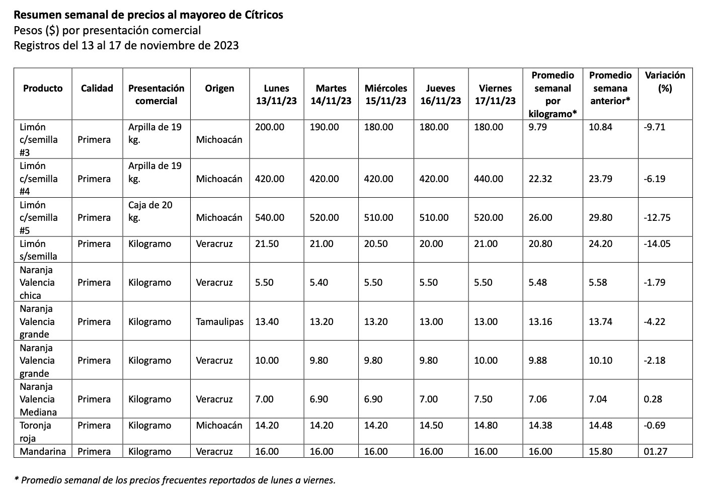 La toronja bajó de $14.48 a $14.38 y la mandarina tuvo una ligera alza al venderse en $16.00 de $15.80 que estuvo la semana pasada.