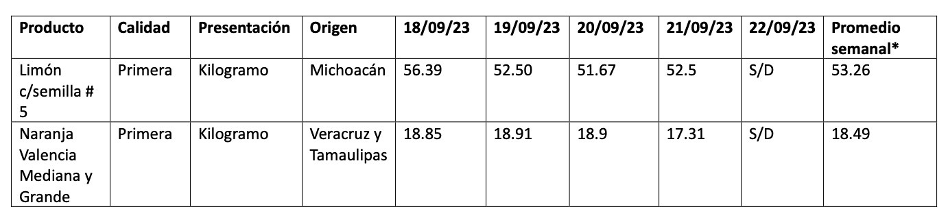 La semana que terminó, según datos del Sistema Nacional de Información e Integración de Mercados Agrícolas (SNIIM), el comportamiento de los precios del limón y la naranja fueron variables, como se muestra a continuación en la siguiente tabla: