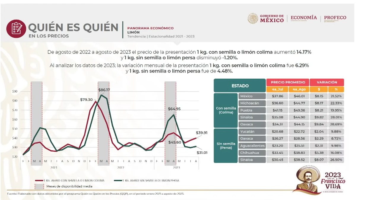Con una variación de 8.17 pesos más, el limón michoacano con semilla registró un incremento en el kilogramo, en el periodo de la cuarta semana de julio a la cuarta de agosto, informó en la conferencia mañanera de la Presidencia, Ricardo Sheffield Padilla, titular de la Procuraduría Federal del Consumidor (Profeco).